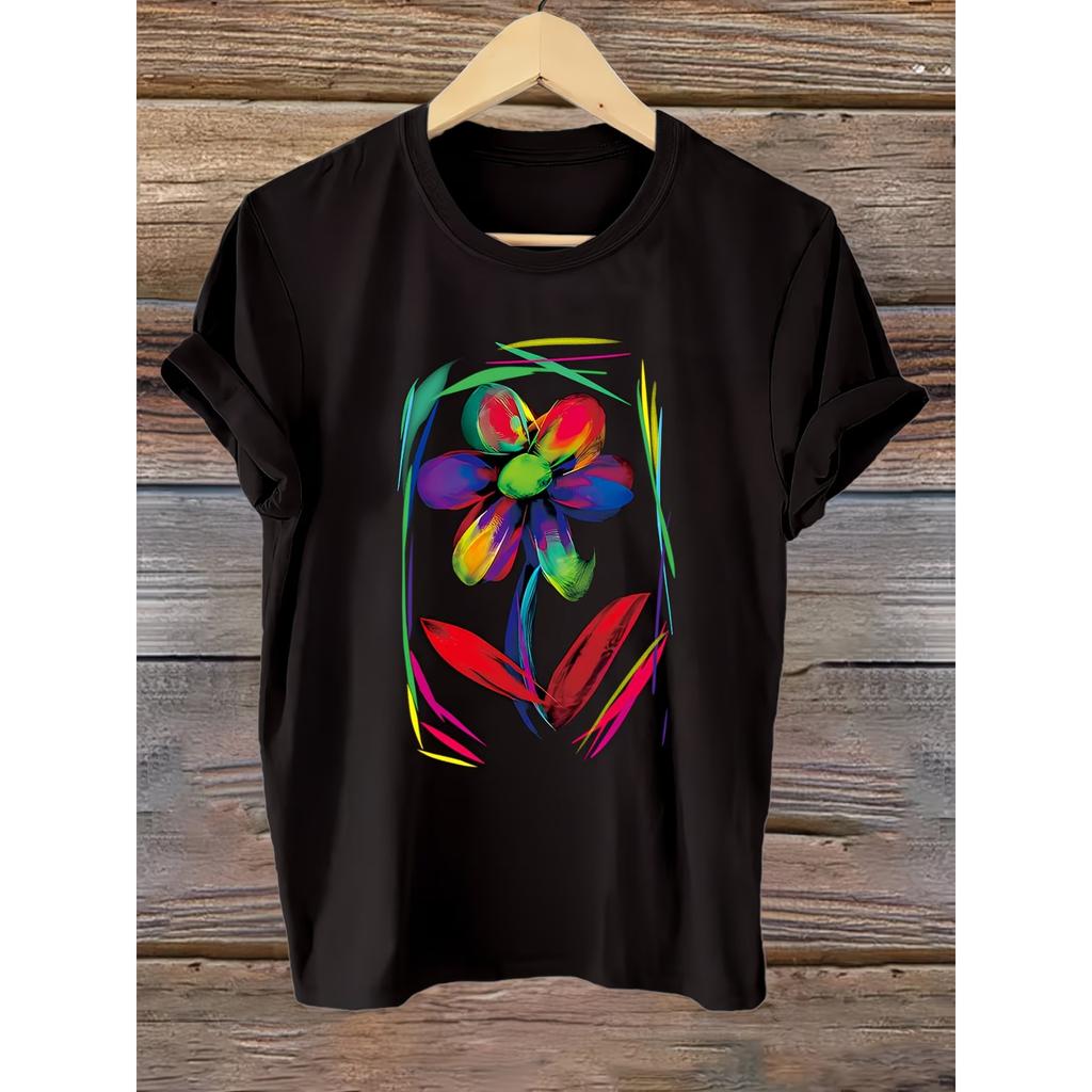 Women's Vibrant Floral Print T-Shirt, Short Sleeve Crew Neck Casual Top for Summer & Spring