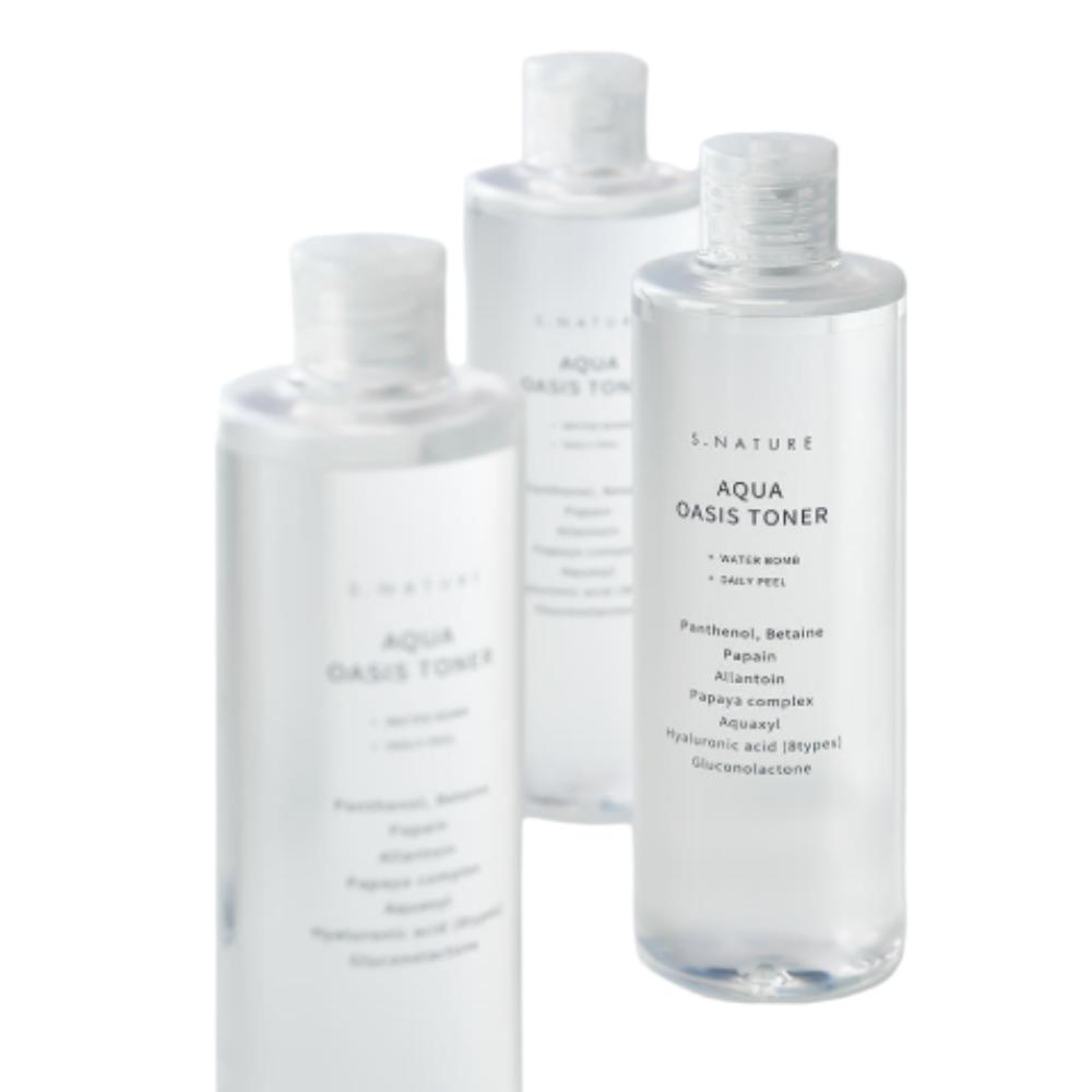 S-NATURE Aqua Oasis Toner 300ml, Korean hydrating toner, hyaluronic acid face toner, K-beauty oasis toner, sensitive skin soothing toner, S-NATURE Korea, moisture layering toner, alcohol-free face toner, deep hydration toner large size, skin texture refining toner.