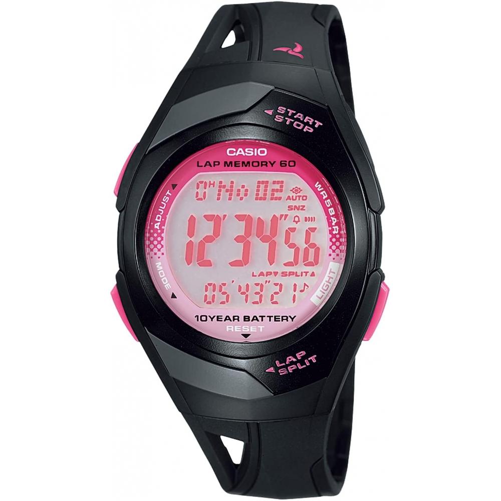 The CASIO collection watch, model STR-300J-1BJH, is available in men's black/pink color. This sports watch features a blind operation structure for easy control during training, and is equipped with various functions. With a lap memory of up to 60 and a countdown timer, it is useful for workouts, and has an auto LED backlight for easy time-checking in the dark. It offers 5 ATM waterproof functionality and can store up to 60 measurement log data.