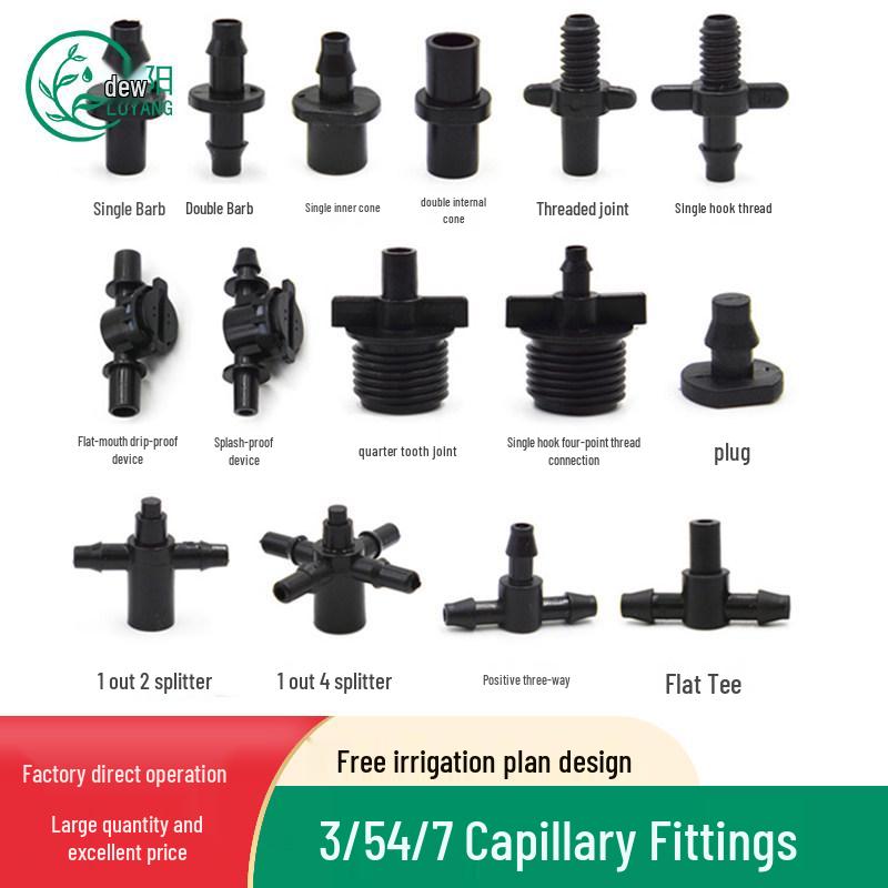 Capillary and Micro-Sprinkler Fittings: Single/Double Hooks, Tee, Straight Connector, Drip Stop, Mountain Bracket, Five-Way, Greenhouse.