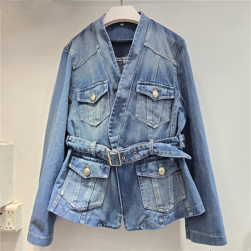 European 2026 Spring V-neck Waist-cinching Slim-fit Lace-up Pocket Belted Jacket Coat