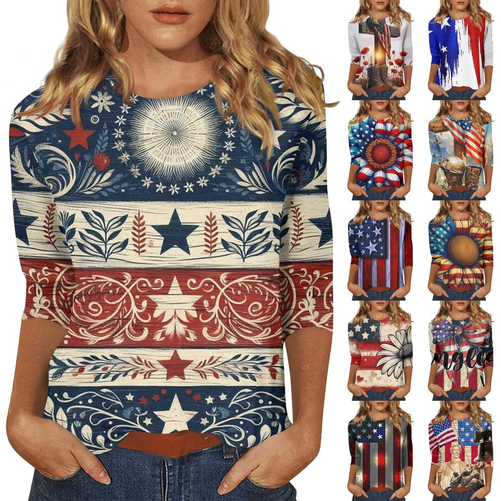 Women's Independence Day Print Round Neck Seven-Eighths Sleeve Top