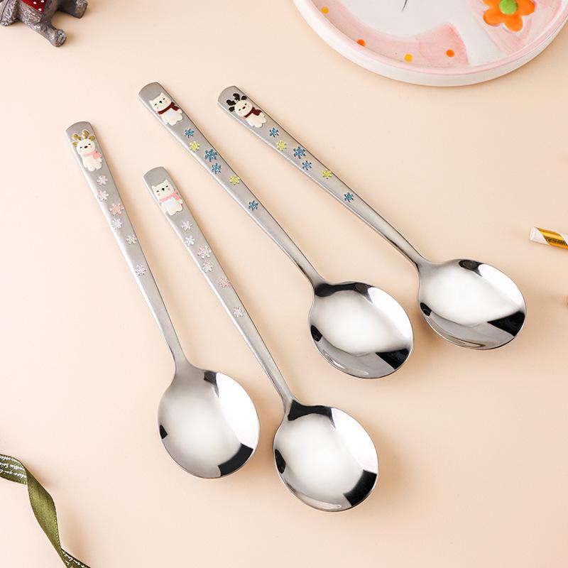 2026 New 304 Stainless Steel Round Spoon Cartoon Embossed Deer Spoon Korean Style Household Long Handle Drinking Spoon yuzi