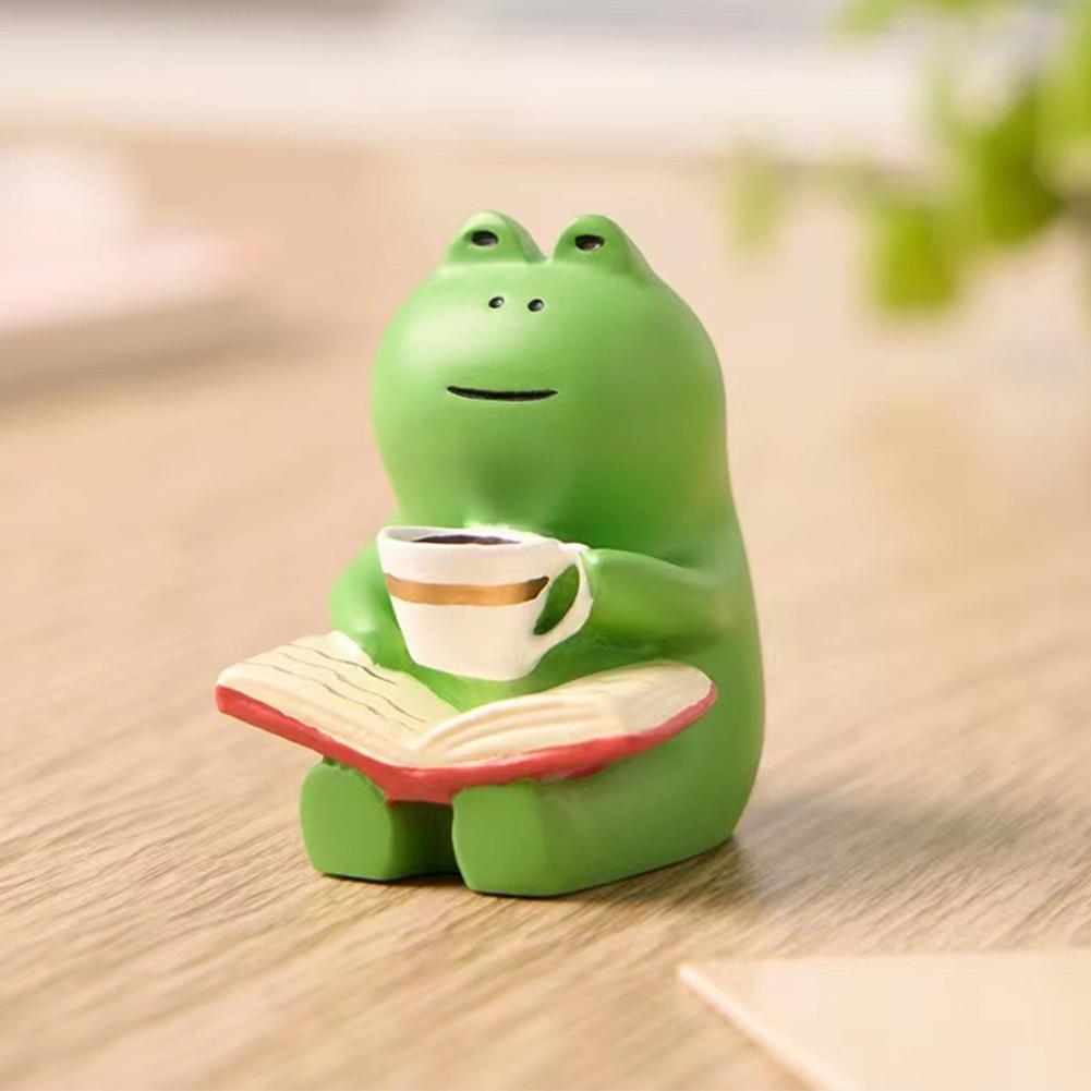 Frog Drinking Coffee Ornament Resin Cartoon Frog Animal Statue Creative Miniature Frog Read Book Figurines Gift for Frog Lovers