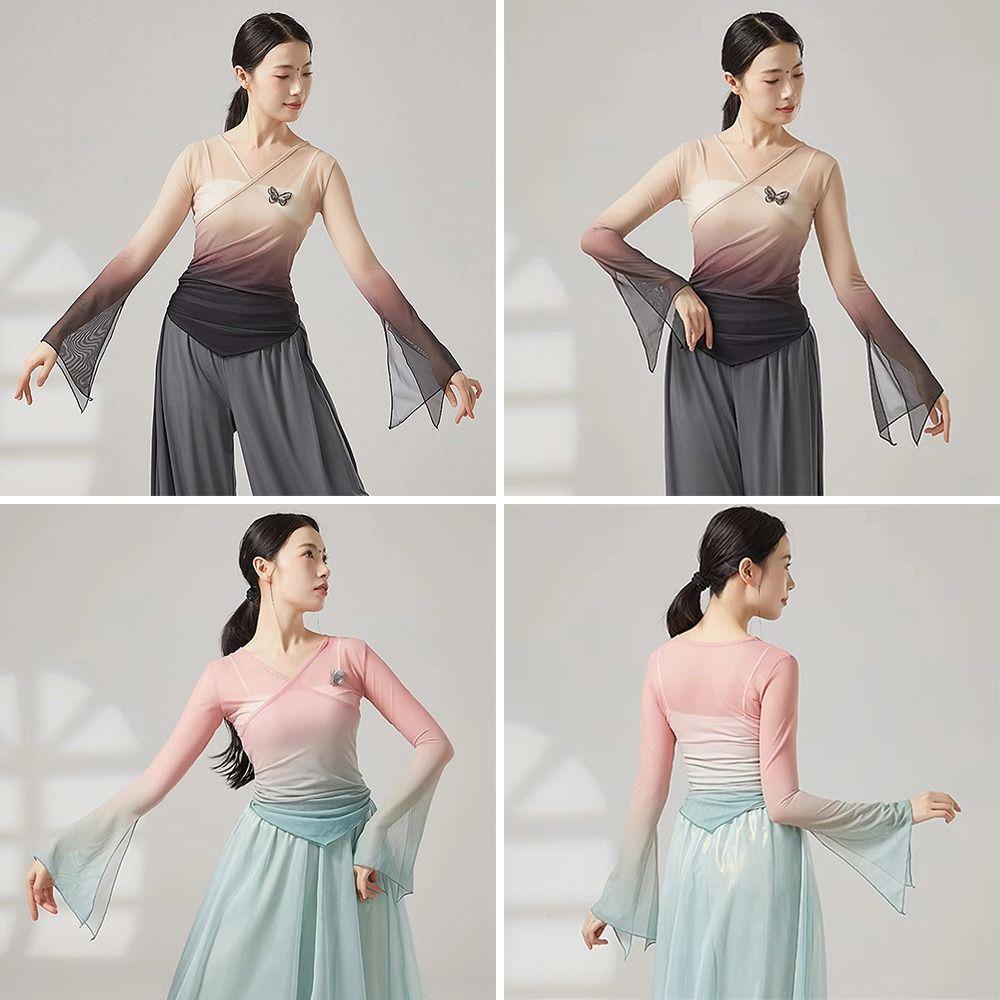 Chinese Hanfu Saree Blouse Gradient Dance Mesh Top Fashion Performance Training Costumes Women