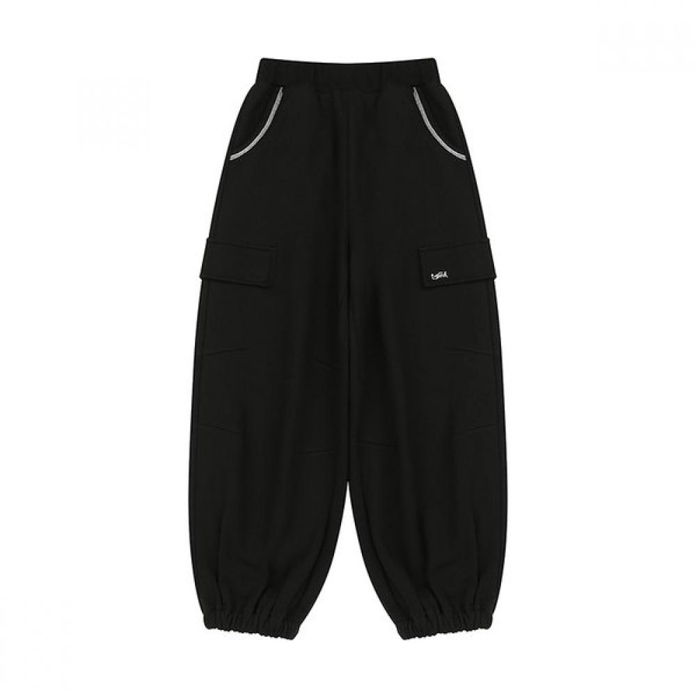 The (Junior) Black Cargo Jogger Pants (T54UAP020) are made from a terry material and feature a streamlined design. The pants have pocket decorations on the side lines, enhancing practicality, and a jogger style with an E-BAND at the hem for a snug fit. The front pockets feature contrasting stitch details for added visual appeal. These pants pair well with the set tee (T54UAT030).