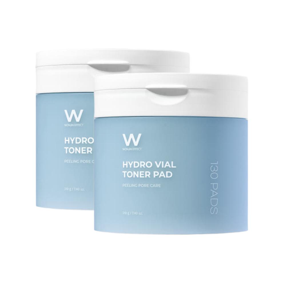 The WONJIN EFFECT Hydro Vial Toner Pads are vegan skincare pads designed to gently exfoliate dead skin cells while delivering deep hydration. Infused with hydrating and pore-care ingredients, these toner pads help refine skin texture, minimize the appearance of pores, and leave the skin fresh and smooth. The soft pad material allows for comfortable daily use without irritation. This set includes two containers with 130 pads each, ideal for convenient and hygienic skincare routines.