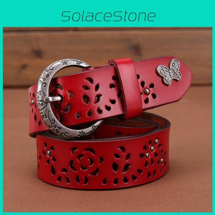 This genuine leather fashion belt features a hollow-out design, adding a stylish touch to casual and office outfits. Crafted from durable two-layer cowhide, it measures 2 to 4 cm in width and is available in lengths of 105, 110, 115, and 120 cm. The alloy buckle with a pin closure ensures secure fastening. Ideal for daily wear, it complements various wardrobe styles. To maintain its appearance, wipe clean with a damp cloth.