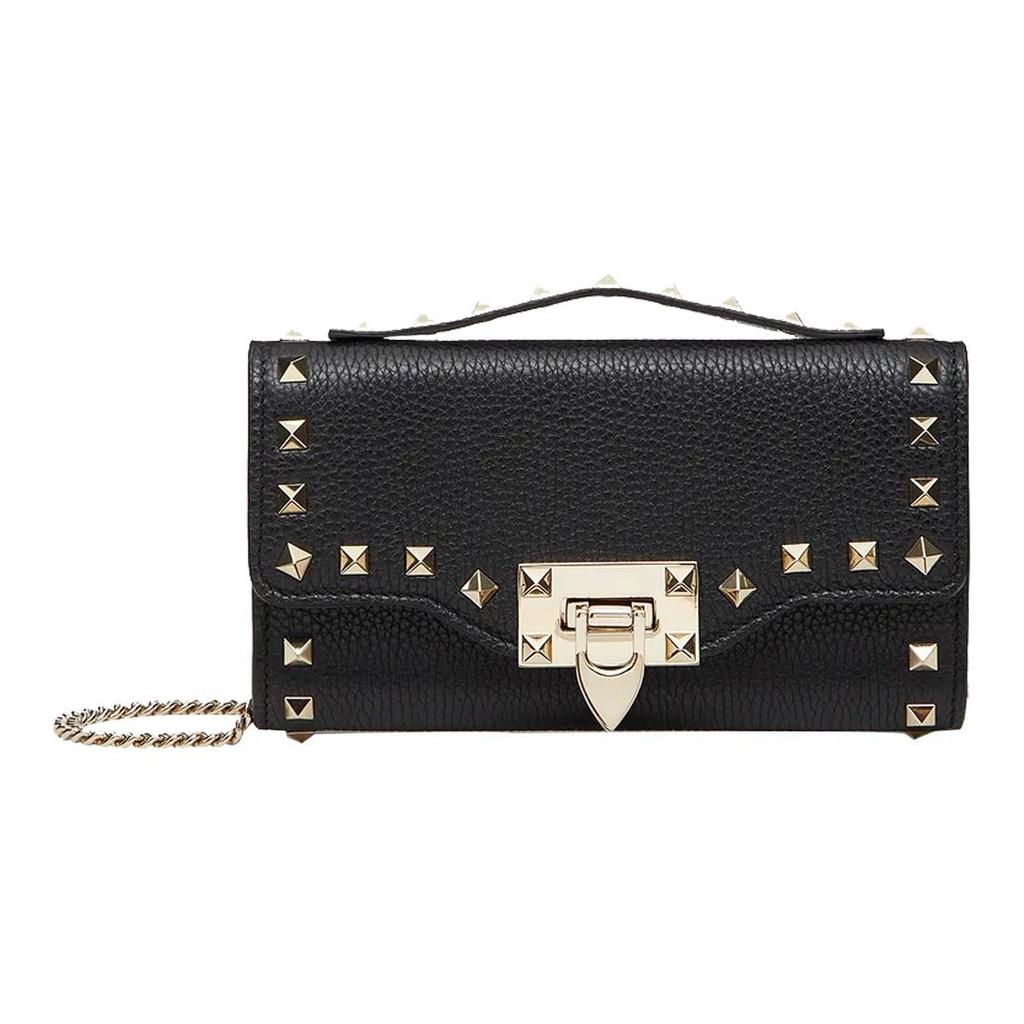 Valentino GARAVANI Grained Leather Wallet with Metal Rivet Buckle Chain Strap Calfskin Women's Black