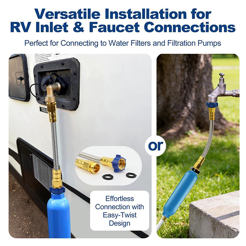 2,FLEXIBLE, STRESS-REDUCING CONNECTOR: Increased flexibility allows easy installation, reduces strain on fittings, helps prevent leaks, protects filters, and ensures smooth, consistent water flow. Ideal as a short connector for RV filters or regulators, quick connections, and tight spaces in RVs, trailers, boats, docks, and campsites.