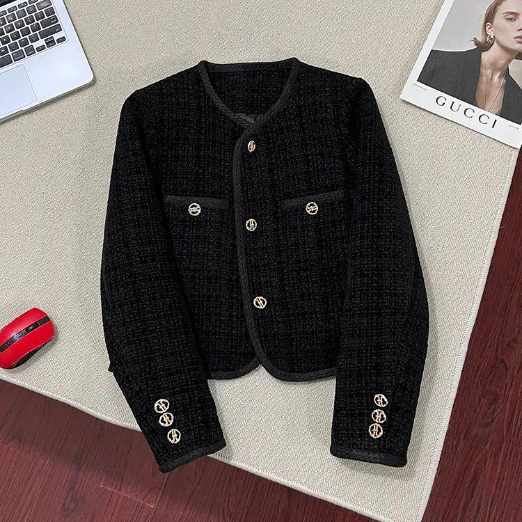 Elevate your seasonal wardrobe with this sophisticated jacket, crafted with a stylish French flair. Designed for the discerning fashionista, it features a sleek round neckline and long sleeves for a timeless silhouette. Made from premium polyester materials, this jacket promises both comfort and durability. Embrace the elegance of black tweed as you step out in a chic ensemble perfect for the autumn and winter months.