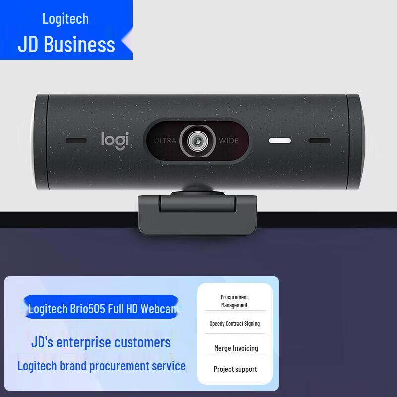The Logitech Brio 505 is an enterprise-grade 1080p Full HD webcam designed for professional use. It features autofocus, a wide-angle lens, and a built-in microphone for clear audio. This clip-on, driver-free camera includes a privacy cover for security and is ideal for remote office work, business meetings, and live streaming.