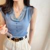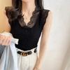 Women's Blue Ribbed Knit Tank Top Lace Trim V-Neck Slim Fit Casual Camisole