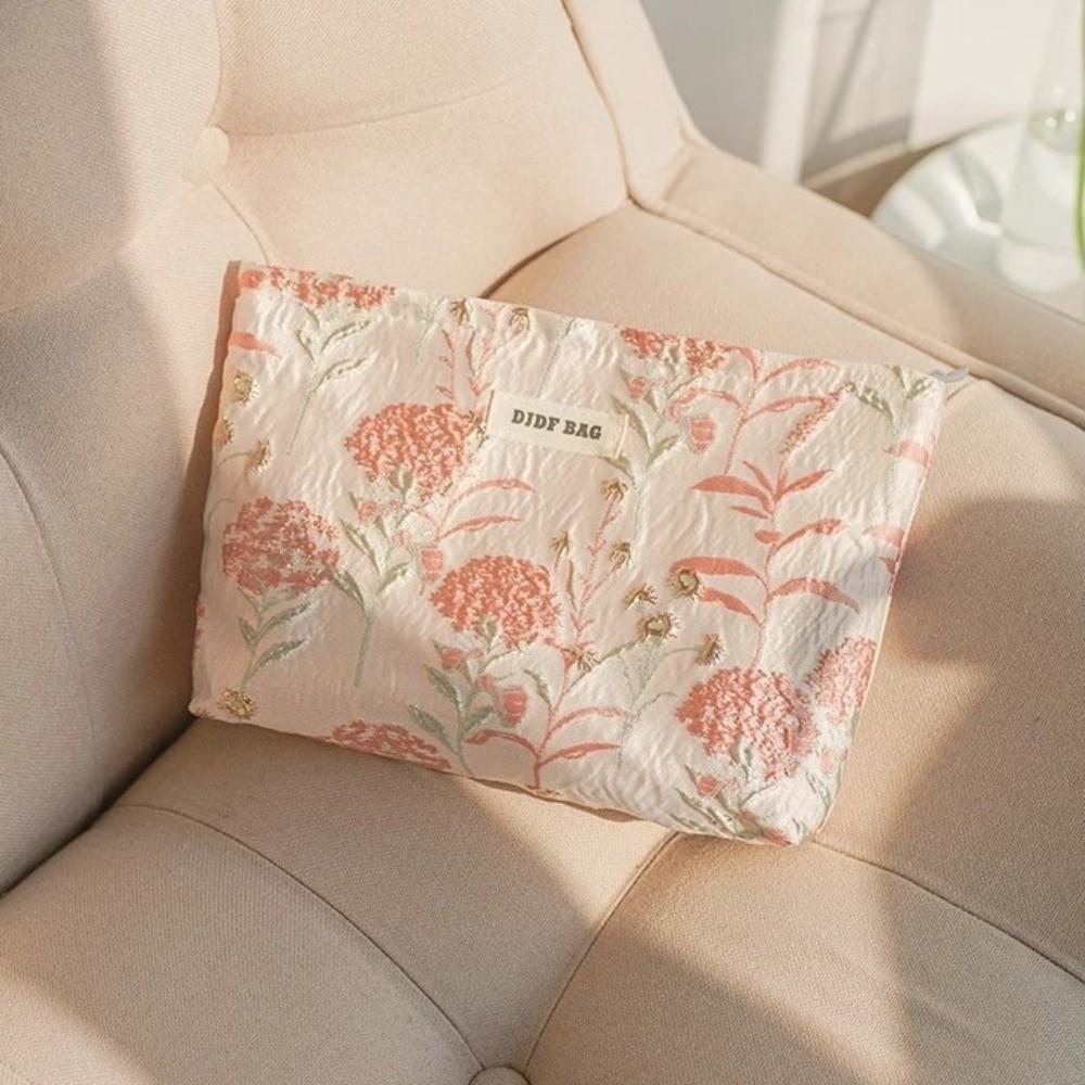 Fashion Large Capacity Makeup Bag Cream Color Zipper Cosmetic Bag Floral Embroidered Toiletries Skincare Storage Bag Women