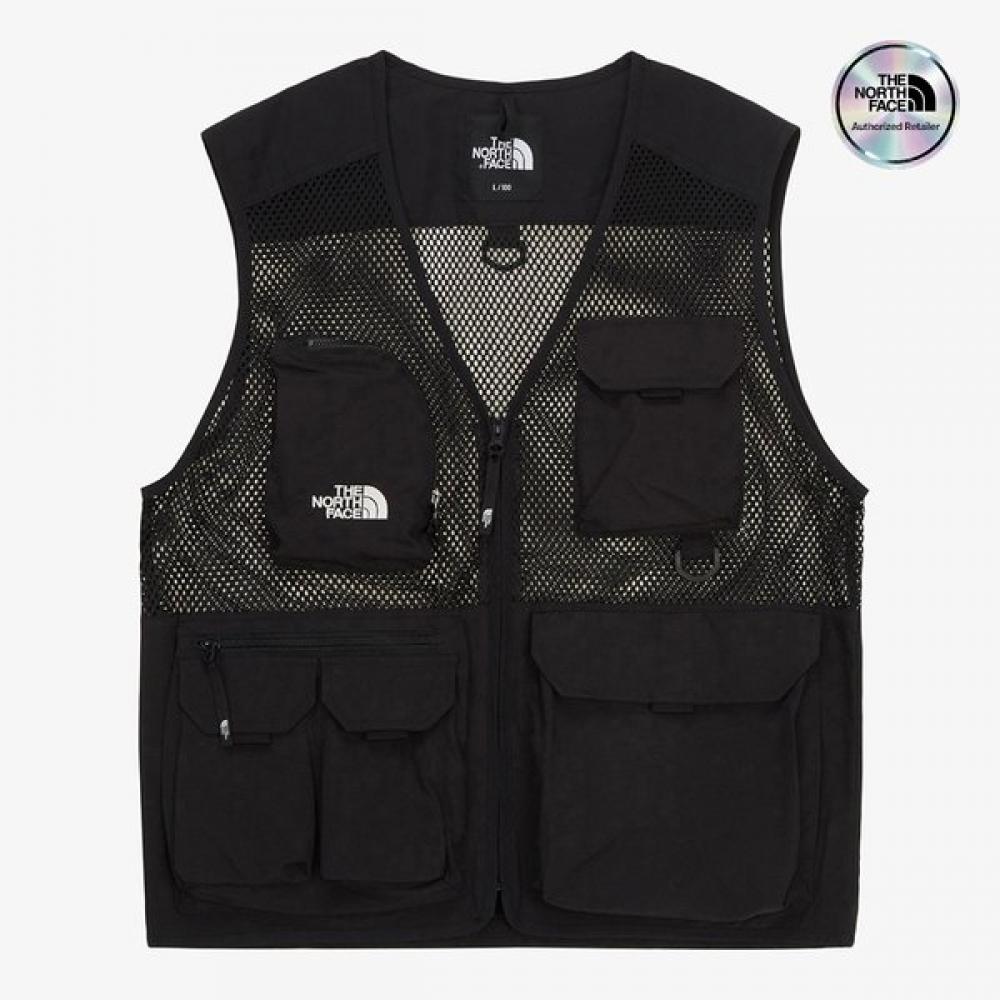 The North Face Men's Bestie Vest NV5VR02A is an outdoor vest made from mesh material. It features excellent ventilation with its mesh construction and a three-dimensional outer pocket design, making it easy to match with other jackets or t-shirts. This product has a half-dome shaped chest zip pocket, double-structure hand pockets, and a back zip pocket for outstanding storage capacity, and the right chest pocket has been modified with a zip to minimize interference with bag straps.