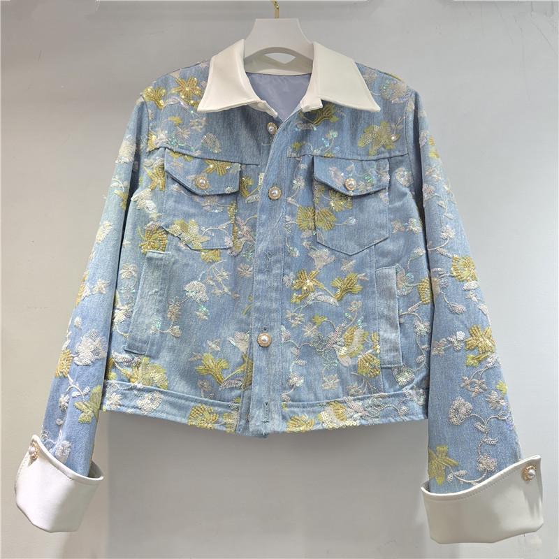 European 2026 Spring Embroidered Sequin Beaded Color Block Denim Jacket