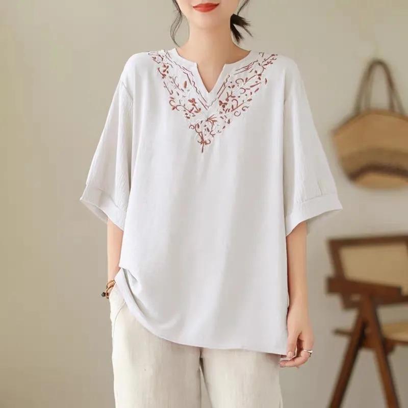 Embroidered Short-sleeved T-shirt for Women Summer New Style Loose and Slimming Belly-covering Three-quarter-sleeved Top for Women