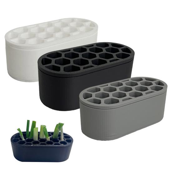This scallion planter is crafted from durable, food-safe PLA plastic, ensuring easy cleaning and long-term use in your kitchen. Designed for effortless hydroponic regeneration, simply insert the scallion base into one of the multiple oval holes and add water—no soil or complex care needed. Its innovative multi-hole structure allows simultaneous regrowth of several scallions, while the built-in water reservoir supports healthy rootlet development.