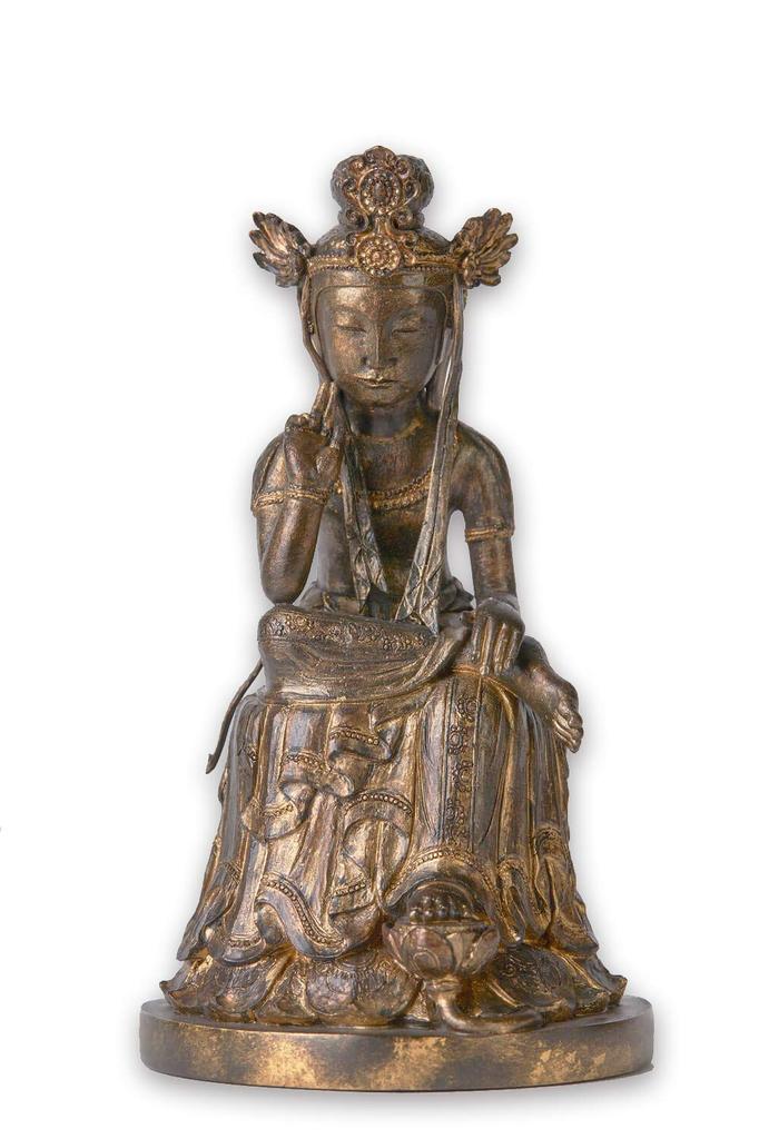 Maitreya Bodhisattva: The Thinking Buddha. Also known as the "Future Buddha," Maitreya Bodhisattva is said to become a Tathagata (Great Buddha) 5.67 billion years after the death of Shakyamuni Buddha, and save all living beings. Until then, he will be training in Tushita Heaven. He is well known for his half-lotus pose, with his right foot resting on his left thigh and his right hand resting on his chin, as if pondering how to help us. Isumu's meticulous sculpting is based on the Important Cultural Property "Gilt-bronze Half-lotus Maitreya Bodhisattva," inscribed in 666. While the production of Buddhist statues in Japan began in earnest during the early Asuka period, the later period saw a rise in the popularity of ornate decorations and softer physiques. This statue is considered a benchmark for this new era, and despite its small size, it is a masterpiece with many notable features, including a large headdress and a skirt pattern that appears to be influenced by Sui-style art. At Isumu, we have recreated all of this charm in a statue that is just 11 centimetres tall, creating a tangible presence of a gilt bronze Buddha that is over 1,350 years old.