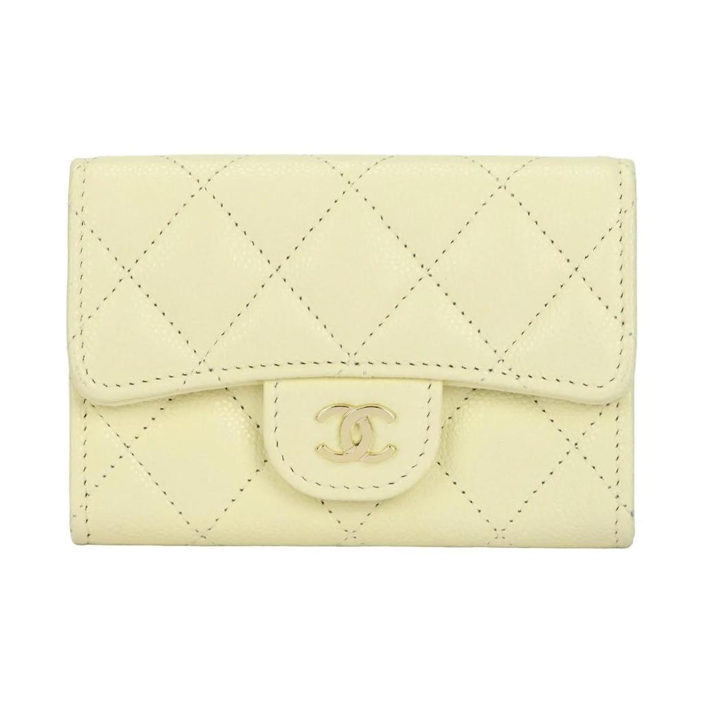 CHANEL 25S classic vertical gold-labeled double C logo quilted diamond pattern shiny grain calfskin with gold metal card holder small size yellow