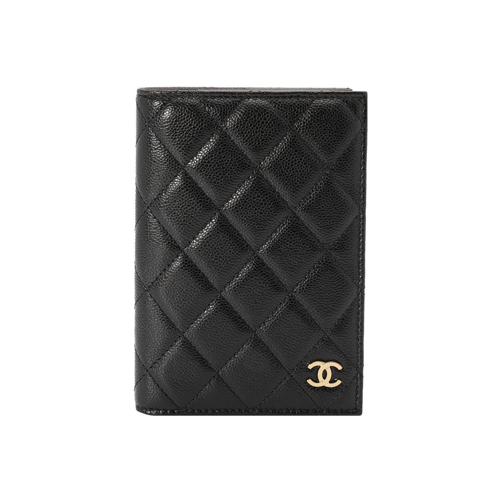 CHANEL 23B Gold Label Logo Diamonds Pattern Grainy Litchi Leather Passport Holder Card Holder Bag for Women Black