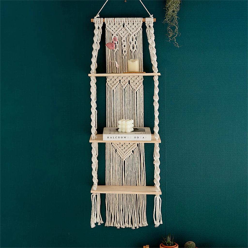 3 Layer Large Macrame Wall Hanging Shelf Macrame Floating Shelf Boho Home Decor Handwoven Rope Plant Display Rack Wall Organizer