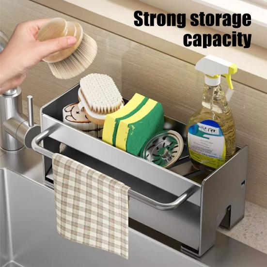Compact Yet Spacious Design: Measuring 9.13 inches long, 3.54 inches wide, and 4.1 inches high, this organizer fits perfectly in kitchens with limited counter space. Despite its small footprint, it provides ample room for detergent bottles, sponges, brushes, soap dishes, and sink stoppers. An integrated towel rack offers convenient drying space for rags, keeping all cleaning essentials neatly organized and easily accessible.