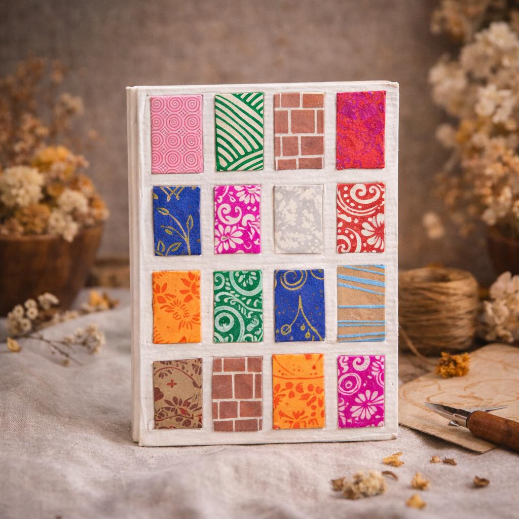Mini tiles — small, repeating geometric shapes arranged in a grid-like pattern — are one of the oldest decorative traditions in craft. They appear in Islamic architecture, Hindu temple design, Moroccan interiors, and Nepali woodcarving alike. Simple shapes arranged in repeating sequences create visual complexity from basic elements. On this cover, the tile pattern is printed in tones that work with the paper's natural colour, producing a design that is structured without being rigid, patterned without being busy.