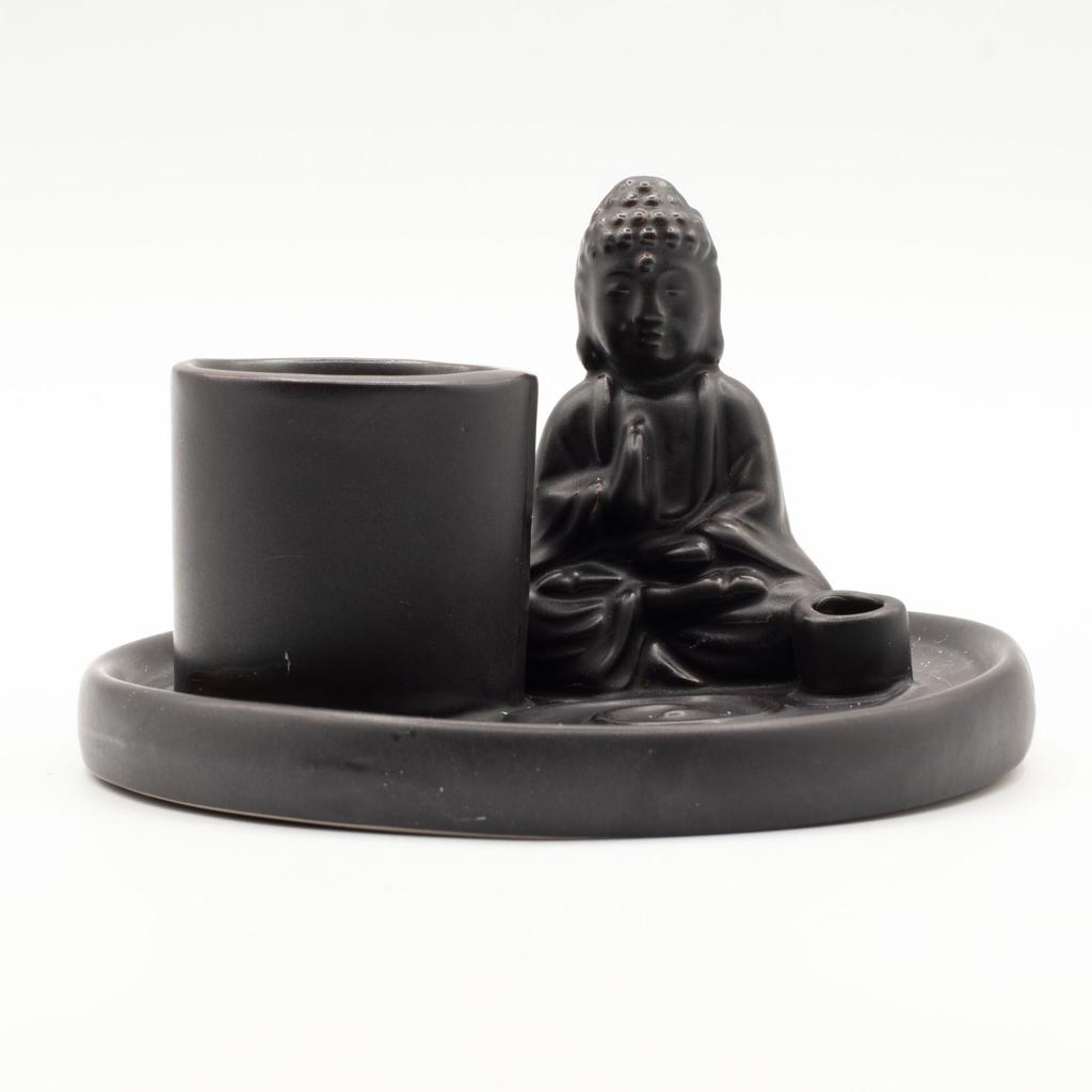 A ceramic incense plate with a Buddha relief design, finished in matt black — the most contemporary and versatile colour option in the range.