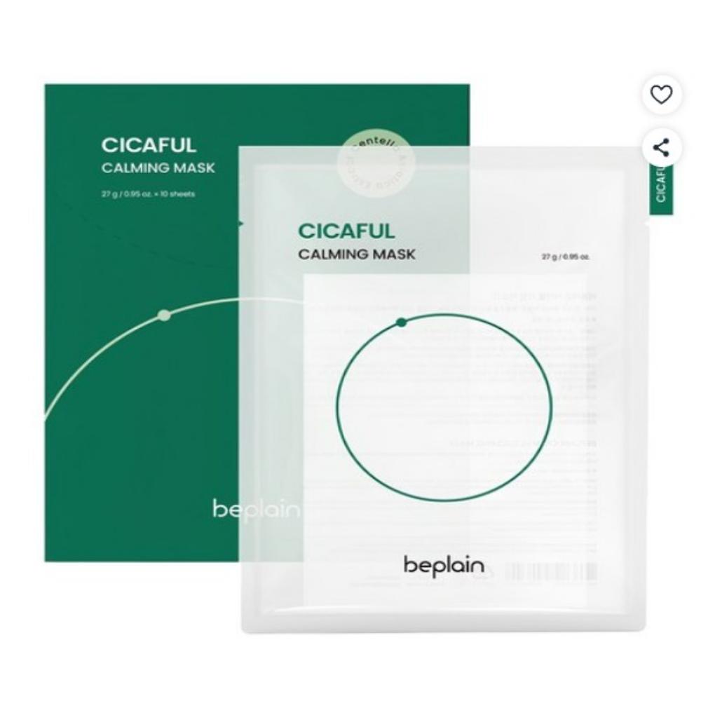 Beplain Cicaful Calming Mask is a soothing sheet mask enriched with centella asiatica (cica) and skin-calming ingredients to relieve irritation, hydrate, and strengthen the skin barrier. The lightweight, gentle mask helps restore comfort to sensitive or stressed skin, leaving it soft, refreshed, and radiant. This set includes 10 masks for convenient daily or weekly use.