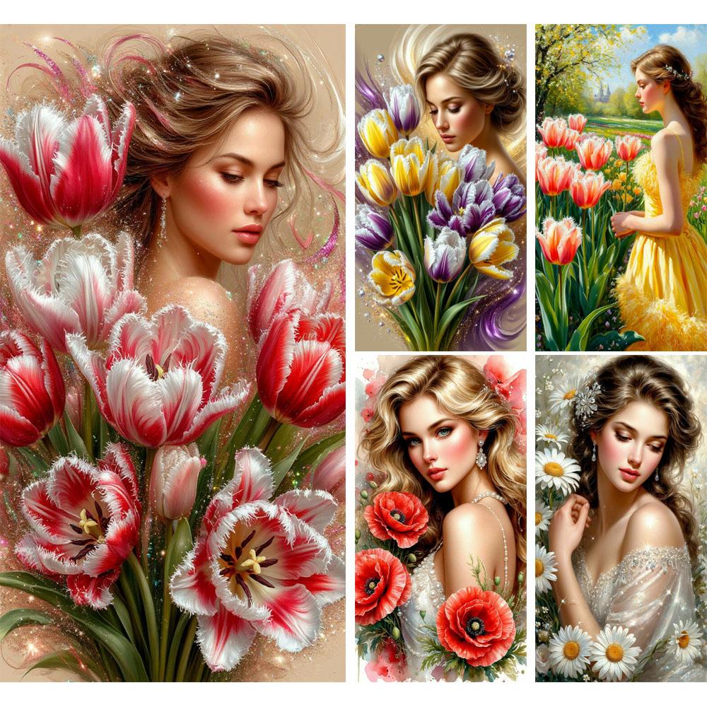 Beautiful Girl and Tulip Flowers DIY Diamond Painting Cross Stitch Full Drills Diamond Mosaic New Collection Home Decor
