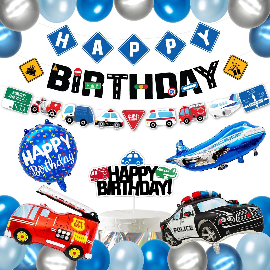 ✅【Set Contents】① Aluminum balloons: 1 x Police Car, 1 x Fire Truck, 1 x Airplane, 1 x "Happy Birthday" round balloon ② Rubber balloons: 5 x Metallic Blue, 5 x Blue, 5 x Light Blue, 5 x Metallic Blue, 5 x Metallic Silver ③ "Happy Birthday" letter banner x 1 ④ Vehicle garland x 1 ⑤ Cake topper x 1 ⑥ Other accessories: 1 x Arrangement tape, 2 x Straws, 1 x Double-sided sticker set (20 adhesive dots)