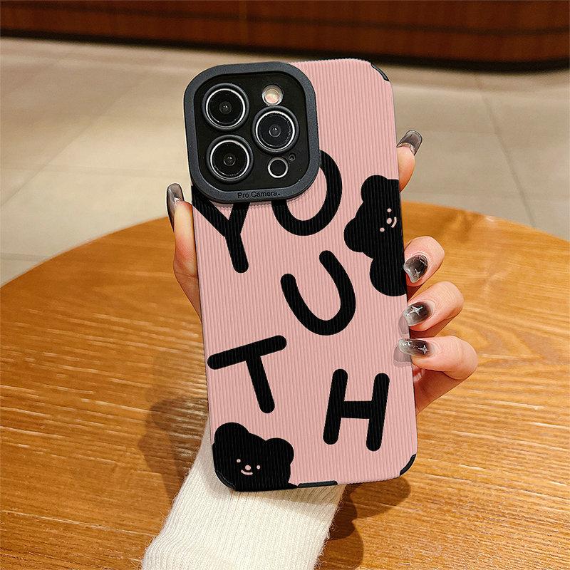 Vertical Leather Shell Youth Black Bear Printed Patterned Shockproof Soft Silicone Case with Camera Lens Full Protection for IPhone Samsung