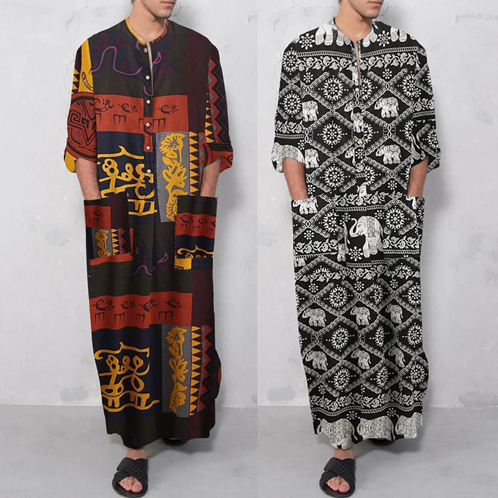 Men's Saudi Arabic Long Sleeve Robe Ramadan Muslim Dress Middle Islamic Clothing
