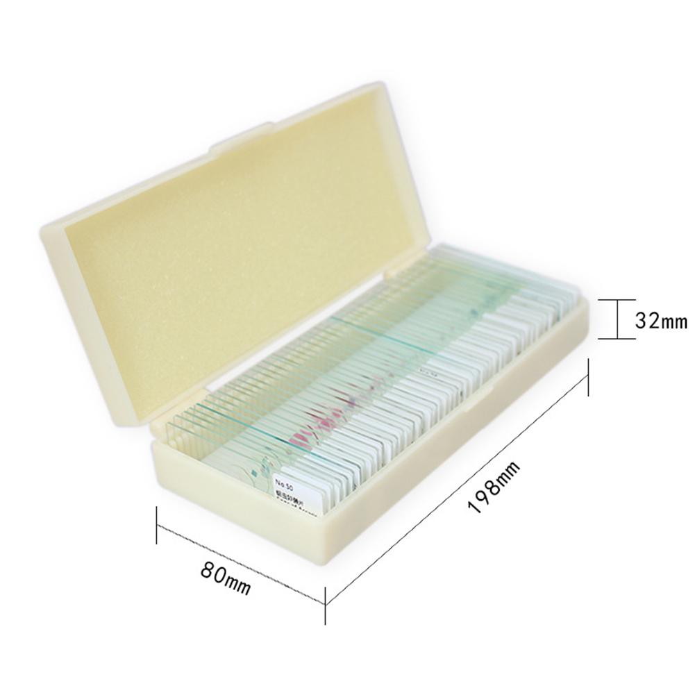 A set of 30/50 microscope slides with prepared specimens for , including , fungi, plant organs, human tissues, mammals, cells and parts for biology education.