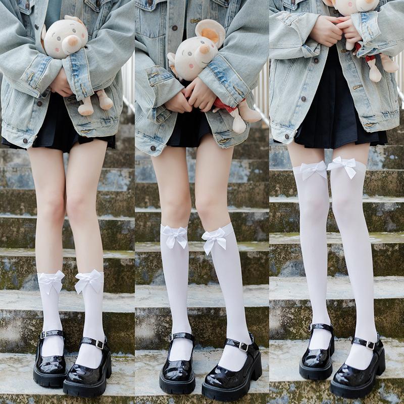 Women'S Socks, Velvet Thin Bow Jk Style College Socks, Solid Color Medium Tube Knee Socks