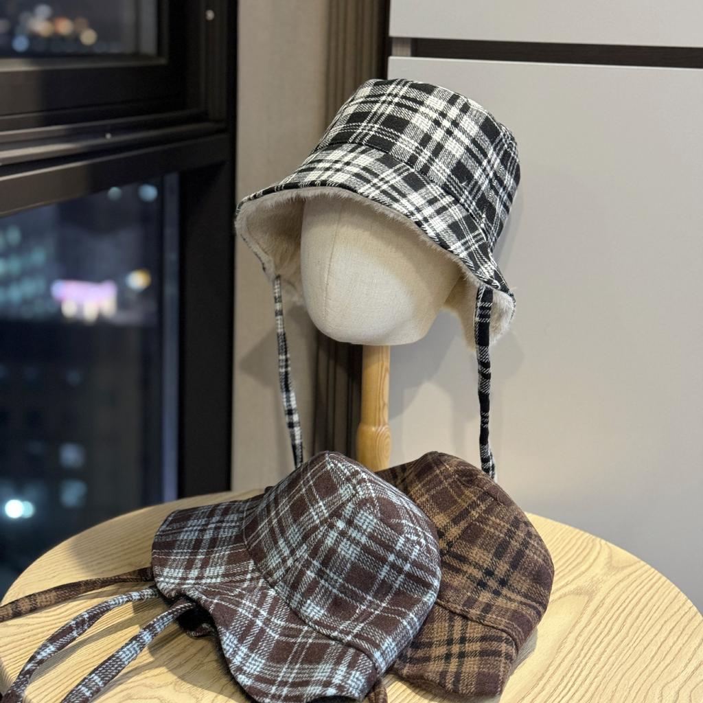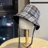 Winter vintage Japanese plaid fleece flat top reversible bucket hat women's fashion outdoor lace-up bucket hat