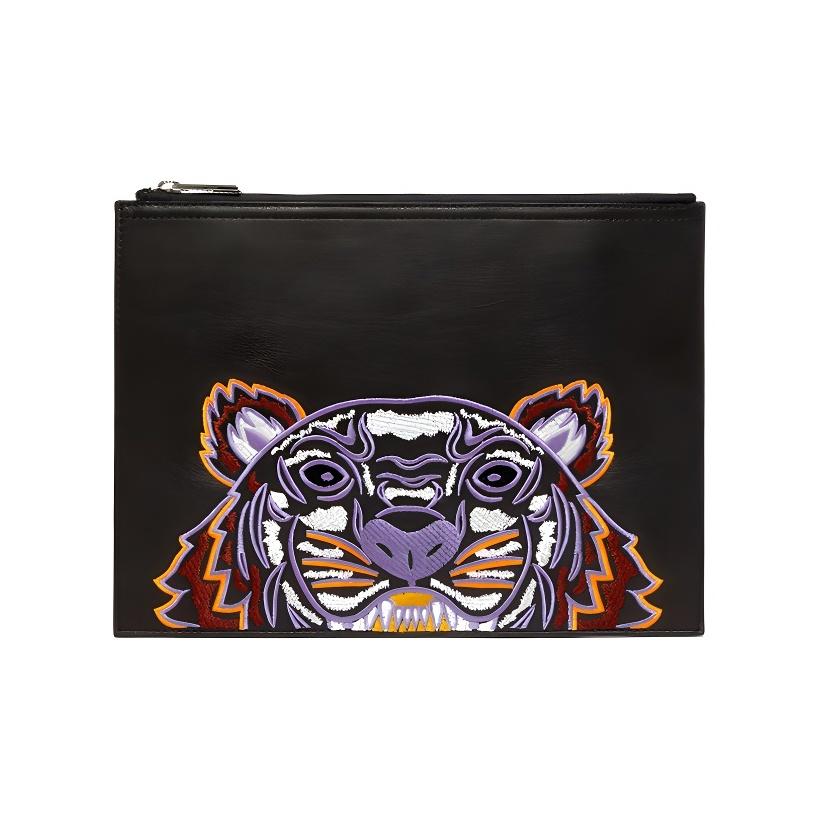 Kenzo Classic Tiger Head Embroidery Color Block Zip Closure Leather Clutch Men clutch Black F965PM322L49-99B