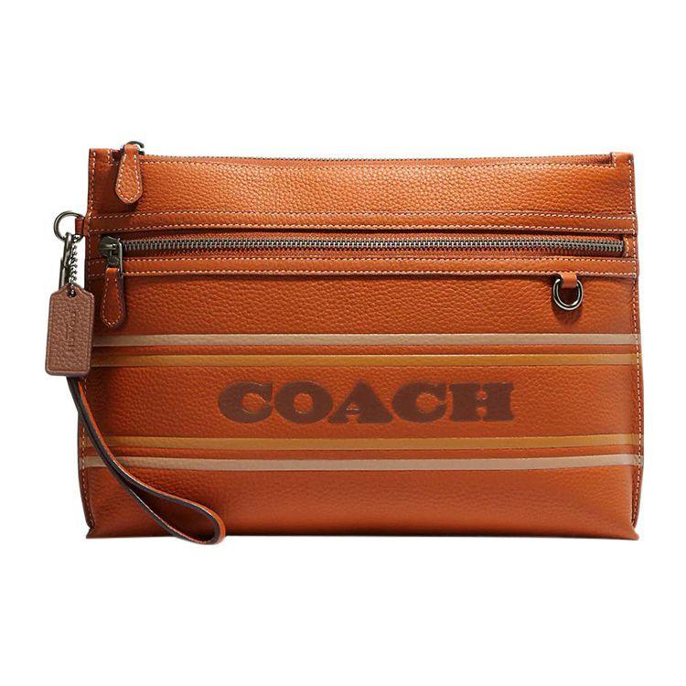 Coach Carry Pouch 29 Embossed Logo Zipper Closure Striped Pebble Leather Storage Clutch Large Women clutch Brown CH069-QBNP6