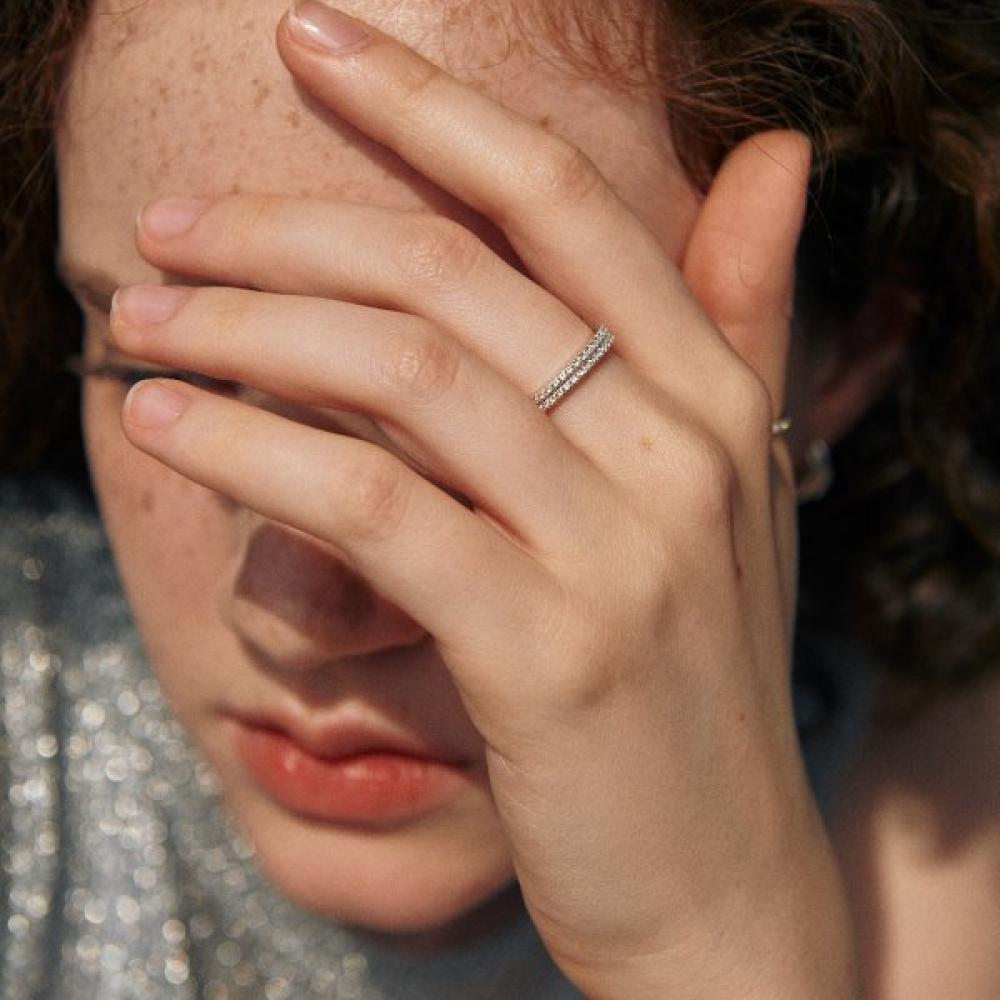 [925 silver] Cinq.silver.210 / anse dew ring is a silver ring designed for comfortable wear, characterized by its thickness. Made with a stone ring set in V-DIA, it enhances a subtle glow when worn, creating a simple yet tasteful mood. The design fits well on any finger from the thumb to the ring finger, making it ideal for wearing on both hands or stacking two together.