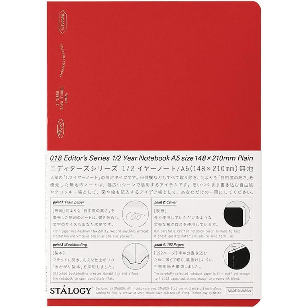 The Nitoms Stalogy Half-Year Notebook A5 Plain Red offers a simple and elegant design that provides space for freely keeping daily records. Made with durable cross paper, it's easy to use and consists of 368 pages for long-term use.