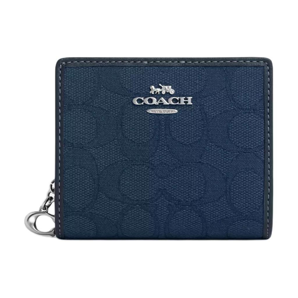 Coach Snap Wallet 11 Monogram Logo Button Closure Signature Jacquard Leather Fabric Wallet Women wallet Silver Dark-Denim CU401-SVPM1