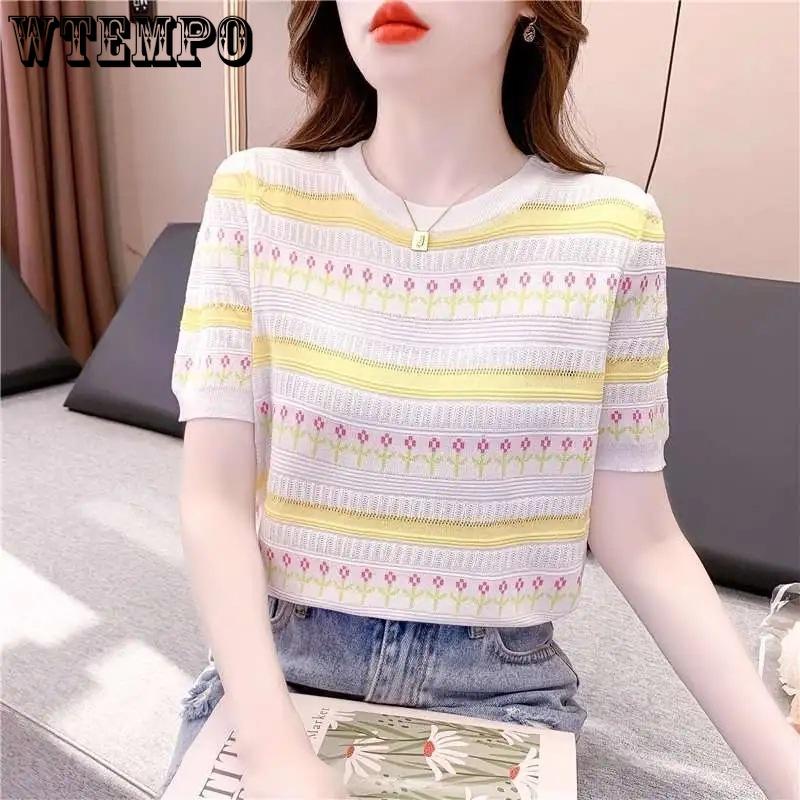 Striped Short Sleeved Knitted Shirt for Women in Summer Round Neck Top Korean Version for Women
