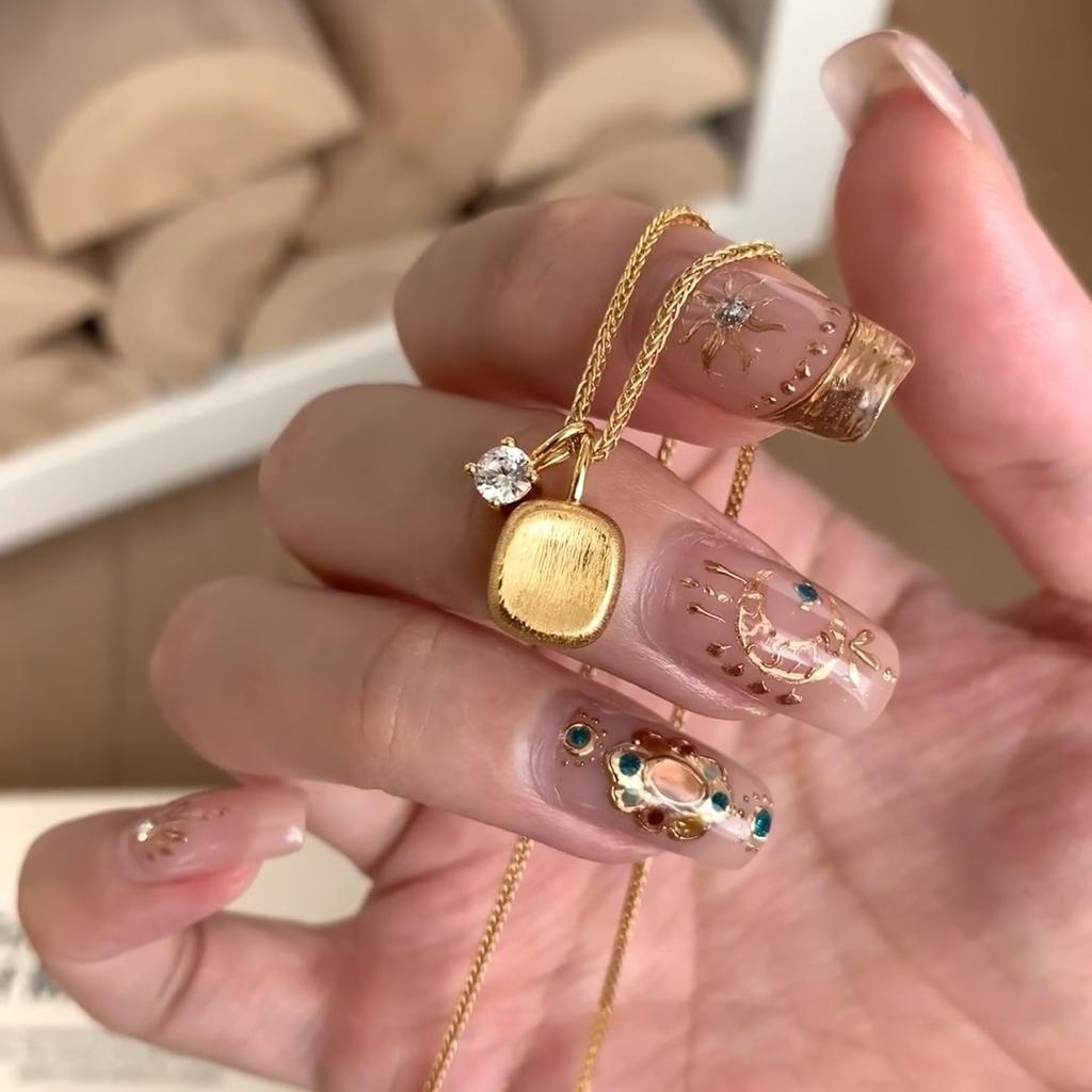 Vintager Antique Brushed Gold Small Sugar Cube Necklace Women'S Light Luxury Gold High-End Sweater Chain Collarbone Chain