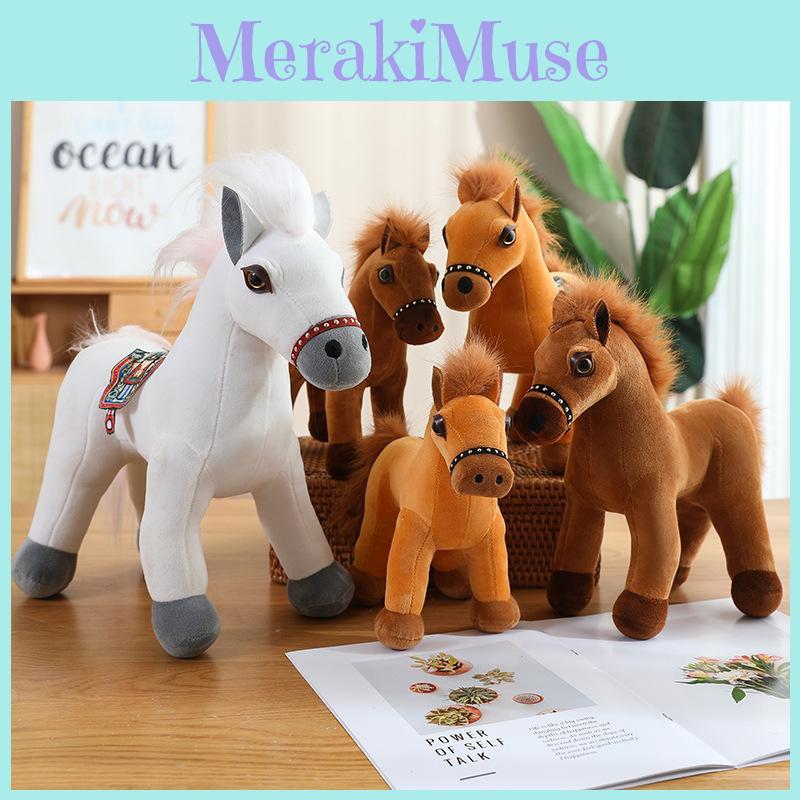 This plush toy depicts a realistic miniature horse, crafted with soft silk velvet fabric and filled with high-quality PP cotton for durability. making it suitable for children's play or collection. The toy features detailed coloring in white, deep brown, or light brown, with or without saddles and wire supports. Ideal for children's room decor or gift-giving, this plush horse is easy to clean with a gentle wipe.