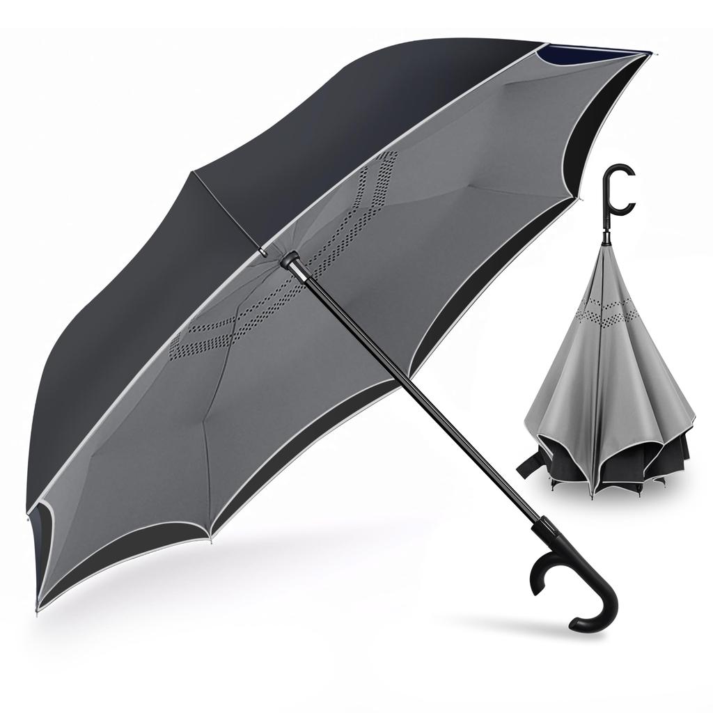 "Innovative Reversible Design Self-Standing Umbrella" The inverted design allows the wet side to face inward when storing the umbrella. Even when closed, you can shake off the water gently to prevent your clothes from getting wet. This is convenient for travelling in cars and trains without bothering others. After use, you can stand the umbrella upright to dry.