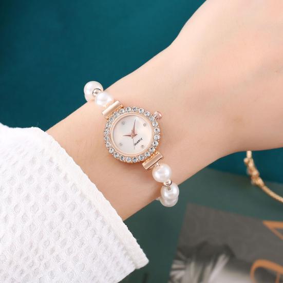 Modaya Uygun Sahte İnci Detaylandırması: Modaya uygun sahte incilerle süslenmiş ince bir bilekliğe sahip olan bu saat, genel görünümünüze bir parça göz alıcılık ve stil katarak onu partiler, ofisler veya gündelik geziler için ideal hale getirir.