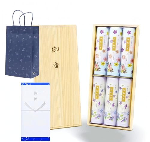 New Yawaragi Floral/Violet Scent Incense Set, featuring both low-smoke and high-smoke incense sticks, in a paulownia wood box with a gift tag and nosh