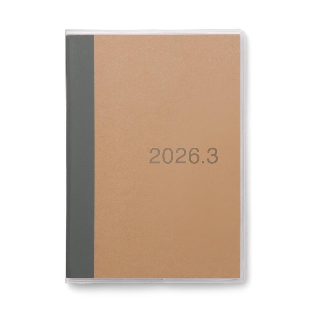 Internal dimensions: Paper size_Page 1: 148 x 105 mm, Center page: 148 x 102 mm, Materials of each component: Body: Paper, Cover: Polyethylene resin, Number of pages: 40, Lined pages: 3-year calendar, Year plan, Monthly spread, Horizontal lines, Binding method: Thread binding, Calendar/Schedule specifications: Rokuyo (traditional Japanese calendar system), Monday start