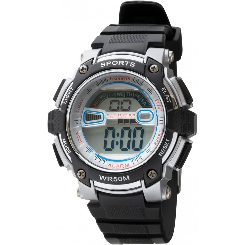 The CREPHA (Crepha) Digital T-Sports Watch model TS-D155-SV is a men's sports watch that combines functionality and design. This product allows easy operation of various features such as a stopwatch, timer, and lighting through four buttons. With its waterproof feature (5 ATM), issues regarding impacts and water in daily life are alleviated. The urethane strap is soft and flexible, enhancing wearability, and is widely used as a diver's watch due to its outstanding durability.